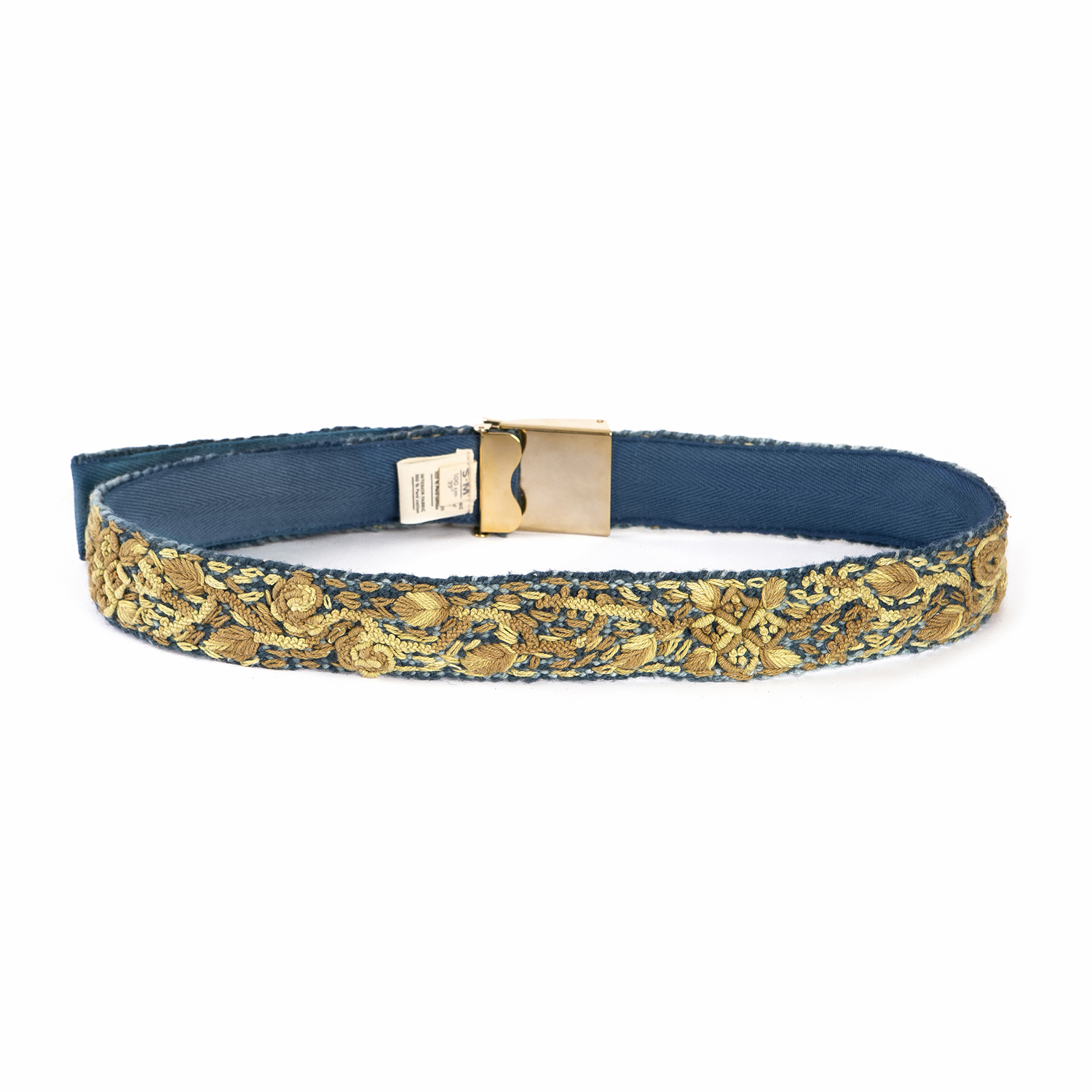 Fita tecida à mão em tear de cinta traseira com lã de ovelha e bordada à mão com algodão peruano, tingida usando a técnica ikat. Vem com uma fivela ajustável de Zamac, com acabamento em ouro 24k.
