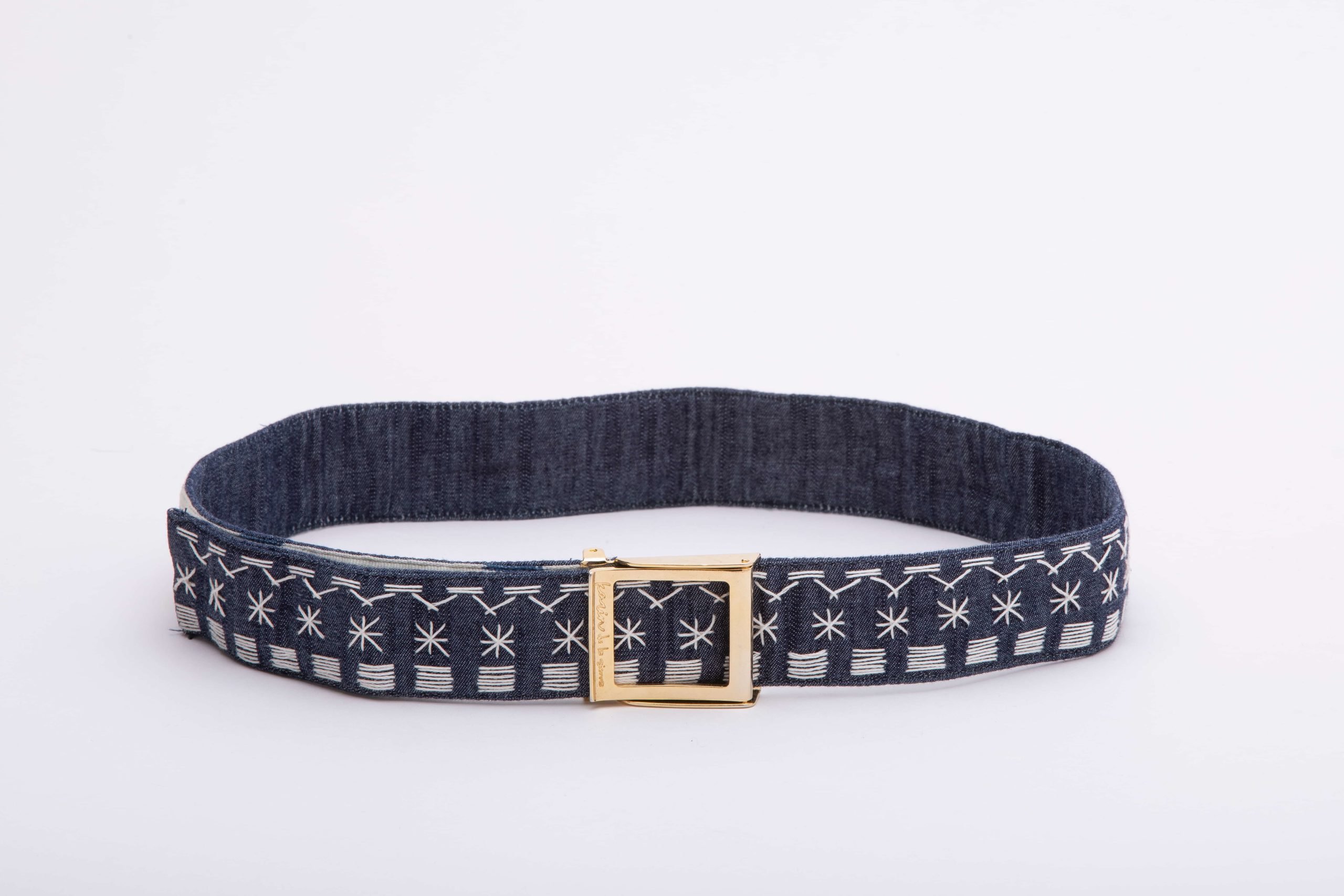Fita tecida em tear de cinta e bordada à mão com algodão Pima peruano, tingido usando a técnica Ikat. Possui fivela ajustável com acabamento em ouro 24k.